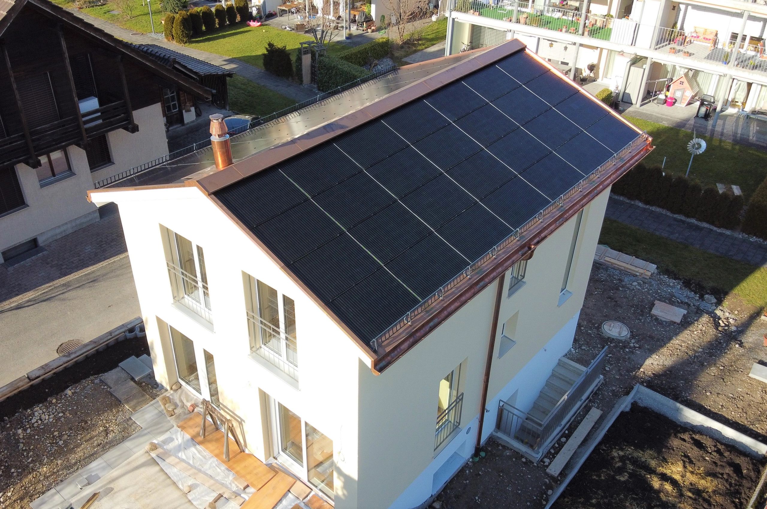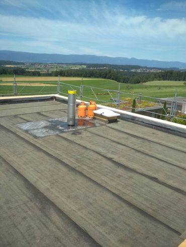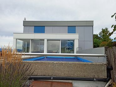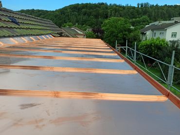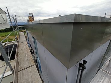 Das Flachdach wurde fast 40 jährig und kurz vor Auftragsbeginn, wurde es undicht. Die bestehende Korkisolation wurde durch PU-Dämmung ersetzt. Auch wurde der komplette Dachrand neu mit Prefa Verbundplatten gestaltet. Das Resultat lässt sich sehen, auf weitere 40 Jahre!